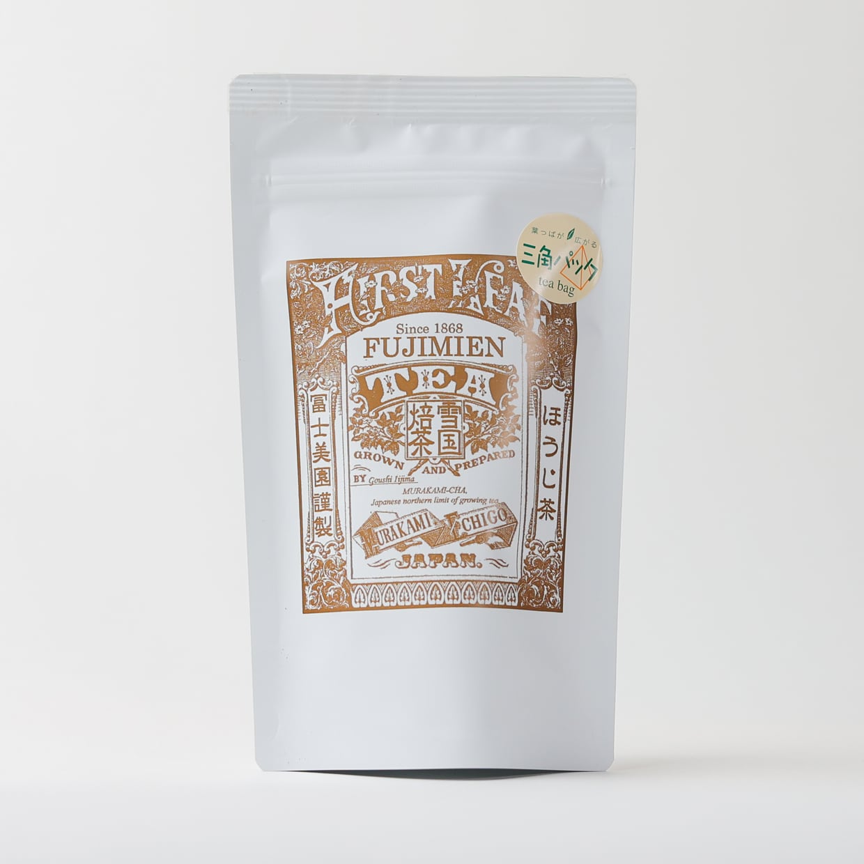 弊店のほうじ茶〈上〉を、ティーバッグでも味の出やすいように加工、葉の開きやすい三角パックに詰めました。